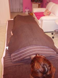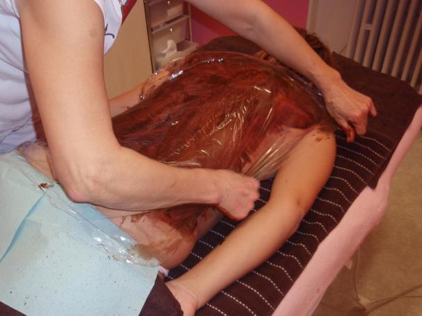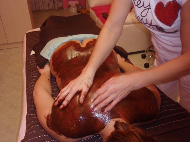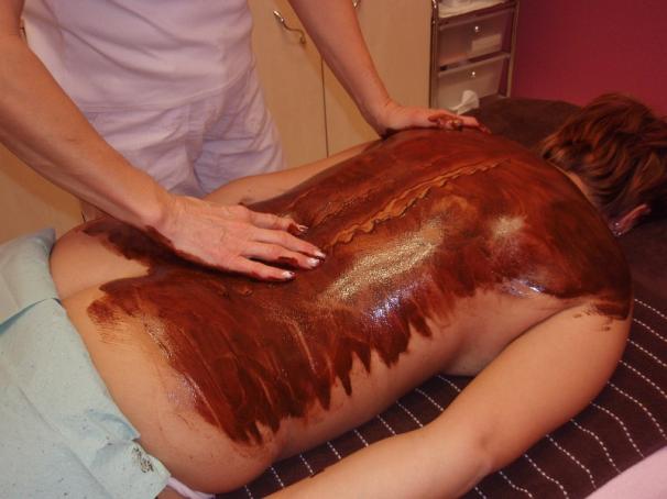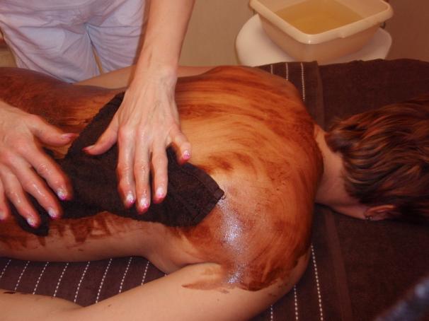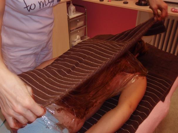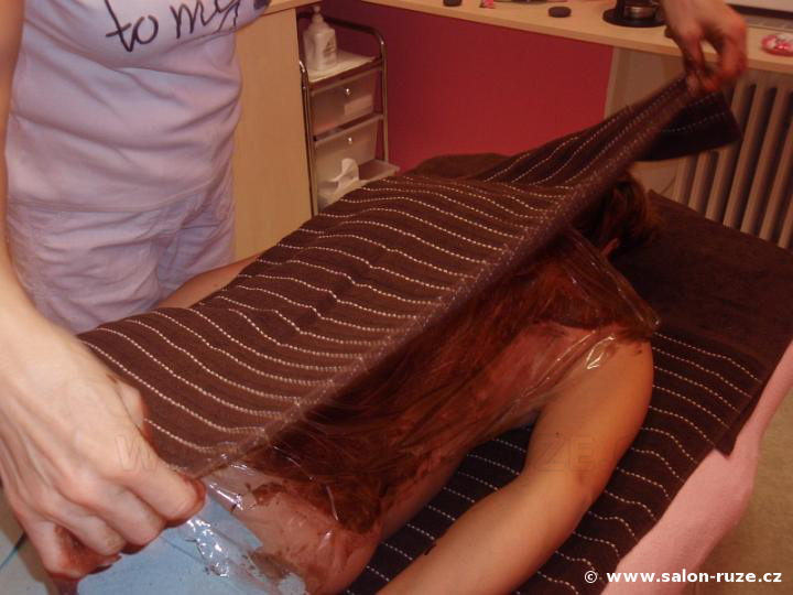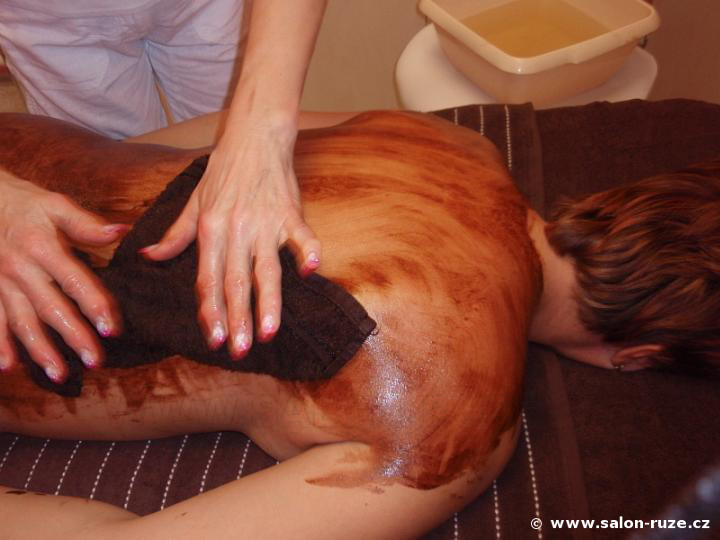 Čokoládová masáž obvykle zahrnuje masáž celého těla a je zakončena zábalem - pro intenzivní působení výživných látek na pokožku. Trvá hodinu a více.